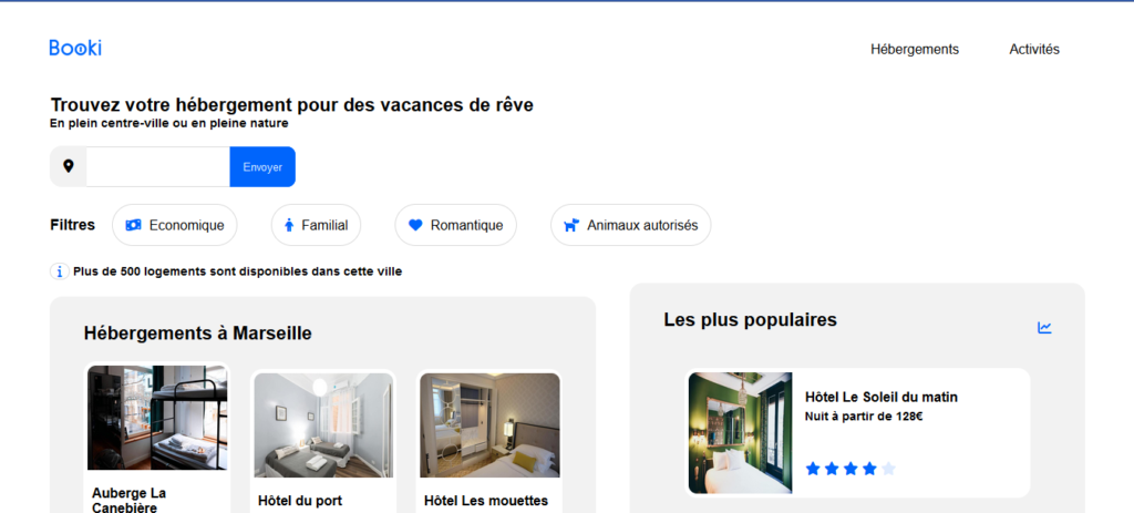 You've found your first internship as a web developer at Booki, a small company offering a vacation planning tool! Its site allows users to find accommodation and activities in the city of their choice. Accommodations can also be filtered by theme, for example their budget or their atmosphere. A new design based on the principles of Material Design has just been created by Loïc, UI designer. Before definitively validating the design, the company decided to create a prototype. You are responsible for creating this prototype by integrating the model in HTML and CSS.